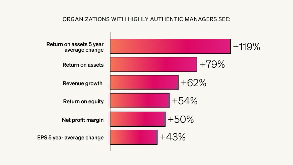 - We found that authentic leaders deliver +50% net profit margin, +79% y/y eps net growth, and +62% y/y revenue growth for their organizations