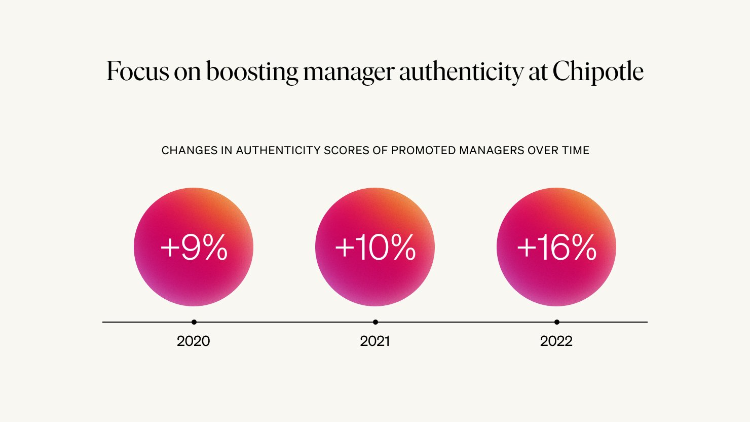 However, once we partnered together, Chipotle’s managers leaned into developing their authenticity and over time were able to promote more team energy, enthusiasm, and focus at work for their team members as a result. As a result of our work together, Chipotle scored in the top 1% for authenticity of all our partners.